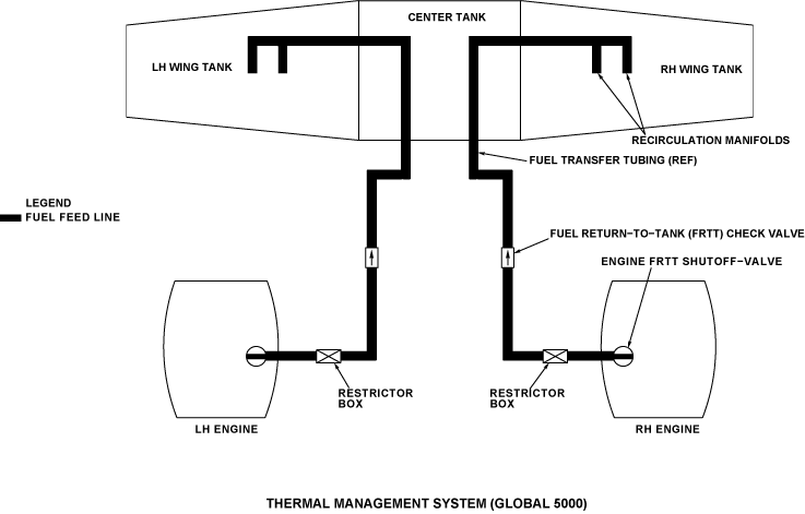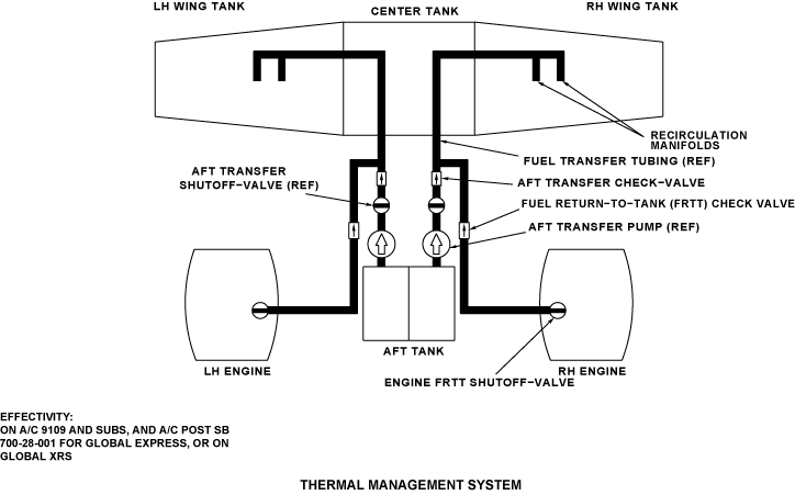 The thermal management system adds heat to the fuel in the wing tanks. The heat is supplied by hot fuel from the engine. This system includes fuel return-to-tank (FRTT) shutoff-valves, check-valves, fuel tubes, and parts of the aft fuel transfer system (only on Global Express/XRS). On Global Express/XRS, the L and R RECIRC push button annunciators (PBAs) on the FUEL control panel control the thermal management system. The engine must be operated to open the FRTT valve because the FRTT valve is high fuel pressure operated.