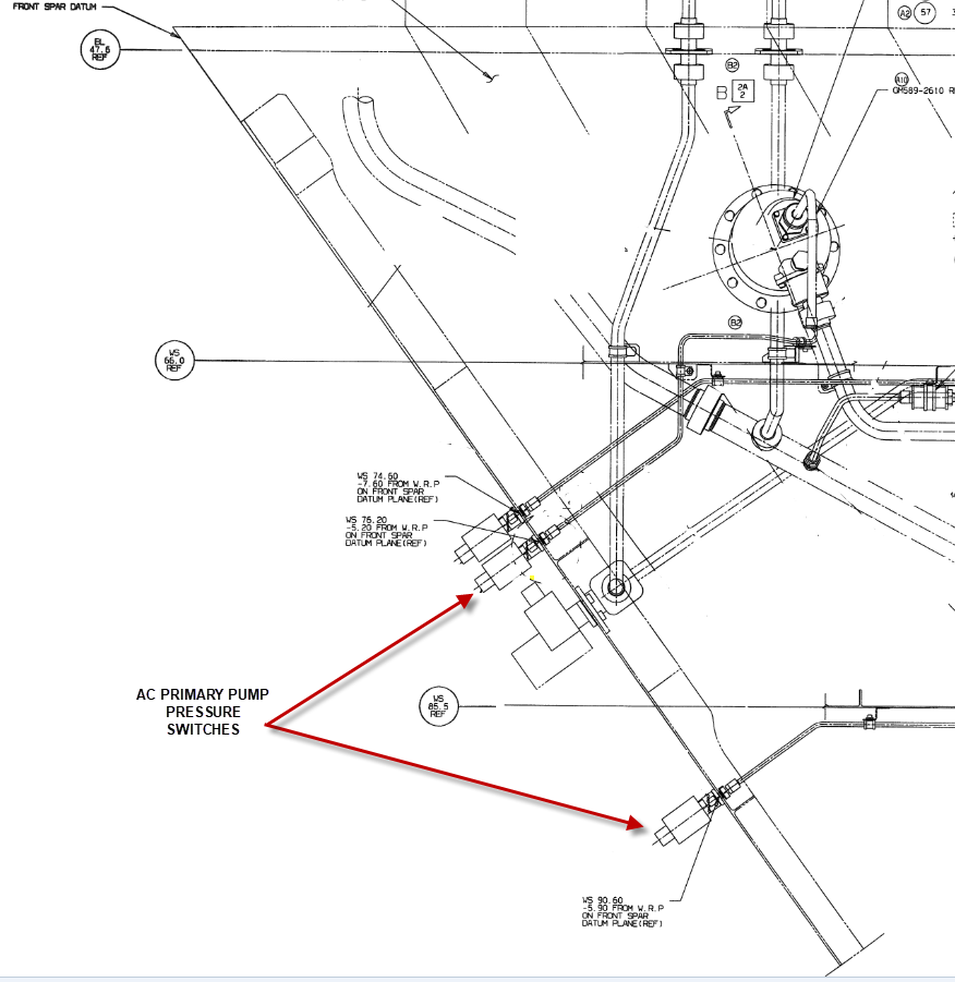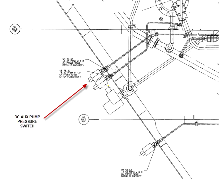 The DC auxiliary pump pressure switches are at the front spar at WS74.6.