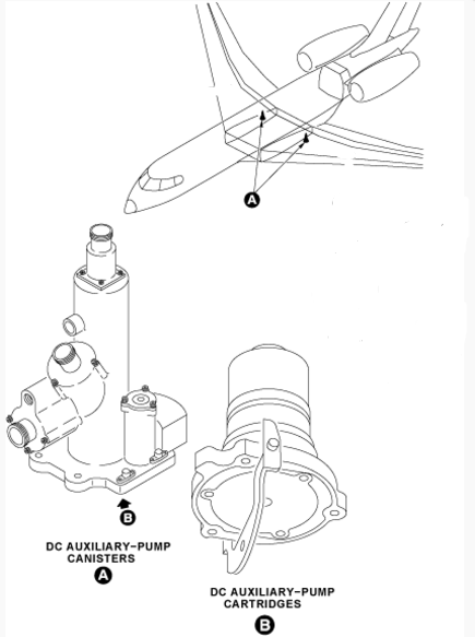 The DC auxiliary pump canisters are the housings for the DC auxiliary pump cartridges. You can remove the DC auxiliary pump cartridges from the DC auxiliary pump canisters without the removal of the fuel. The DC auxiliary pump canisters are at the lower wing skin at WS56.5.