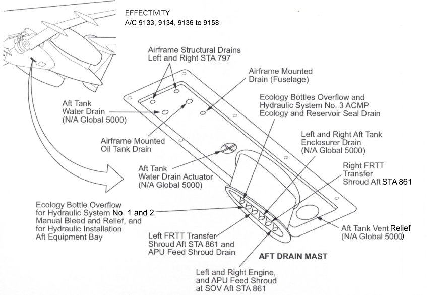 The drain mast is the outlet port for the aircraft that drains flammable residual fluids (oil, fuel and water) through a controlled drainage path to the ambient air. The drain mast is located below the aircraft fuselage from FS861.00 to FS877.25. The fluids tend to collect in different components of the engines, the fuel, the oil and the hydraulic systems.