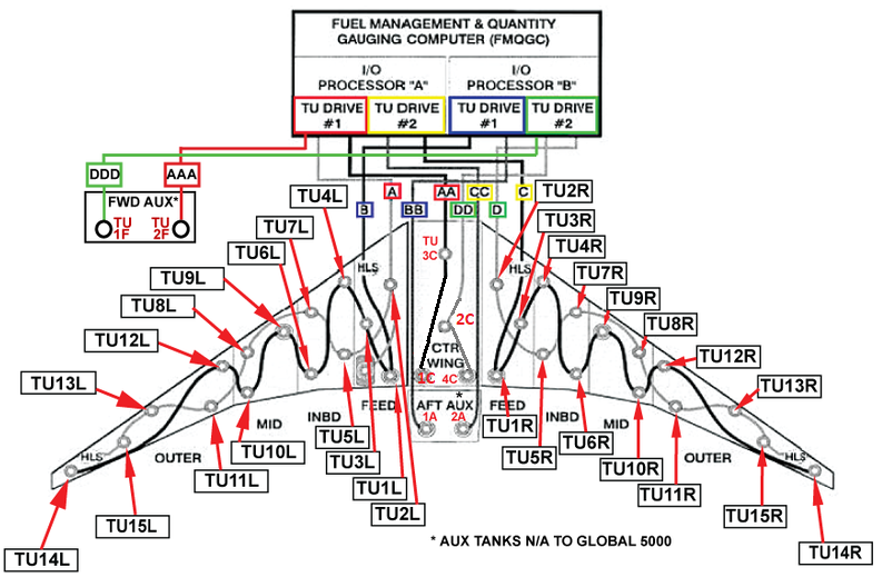 The FMQGC computes the different tank fuel mass, by using the summation of the individual fuel compartment fuel volume and the fuel density value. To provide redundancy, each FMQGC processor interfaces with half the tank units (TU) in each tank through two independent TU drive modules. Each tank unit drive module has independent excitations for each fuel tank.