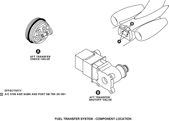 The aft transfer check valves are spring-loaded, poppet-type valves. The aft transfer check valves are installed in the aft transfer fuel lines, at the aft transfer shutoff valves, near FS877.25. The aft transfer check valves control the fuel flow to the wing tanks. The aft transfer check valves stop the opposite flow of fuel from the wing feed tanks.