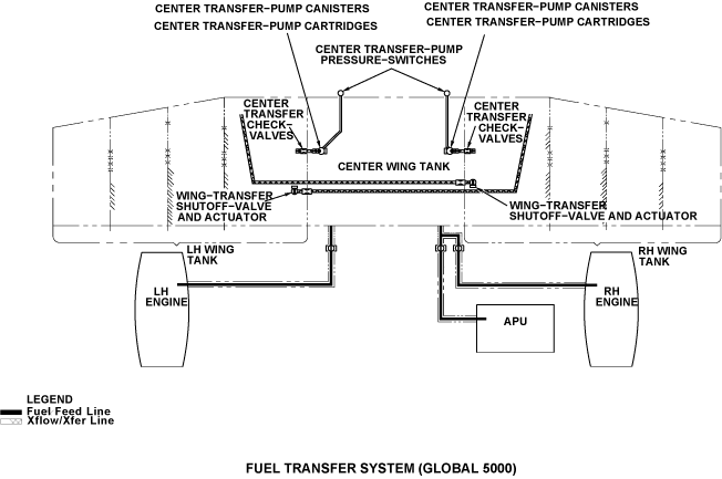 The fuel transfer system includes the center transfer, wing transfer, and aft transfer (Only on Global Express/XRS) of fuel. The fuel flow is from the center tank and aft tank (Only on Global Express/XRS) to the left and right feed tanks.