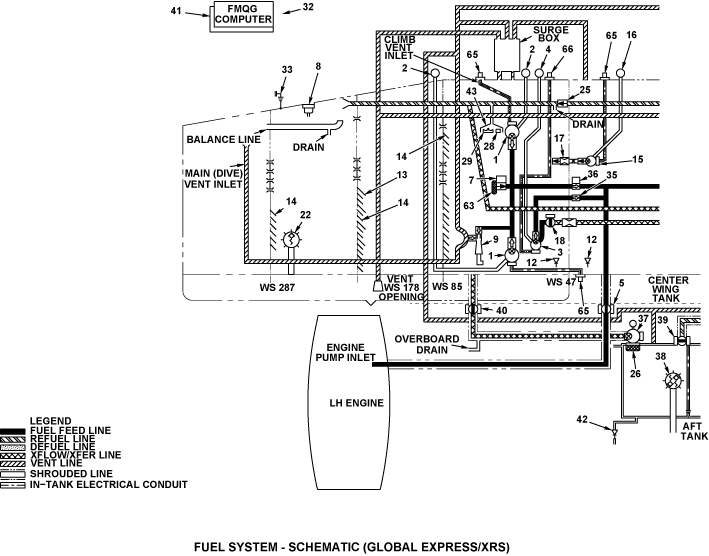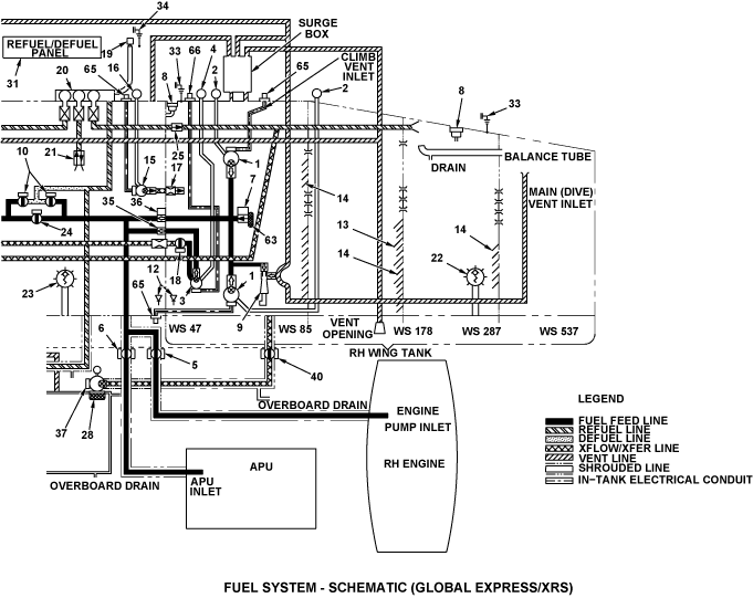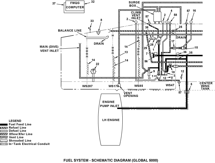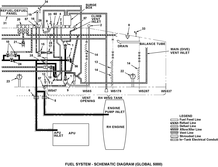 The part of the wing tank between WS47 and the rib at WS87 is the feed tank. Fuel flows by gravity into the feed tanks from the outboard sections of the wing tanks. On Global Express/XRS, the fuel from the center tank and the aft tank also moves to the feed tanks, and on Global 5000, the fuel from the center tank also moves to the feed tanks. The feed tanks connect to each main fuel tank and supply a constant fuel flow to the engines. The tanks are vented to atmosphere and slightly pressurized by a NACA scoop located on the lower surface of each wing.