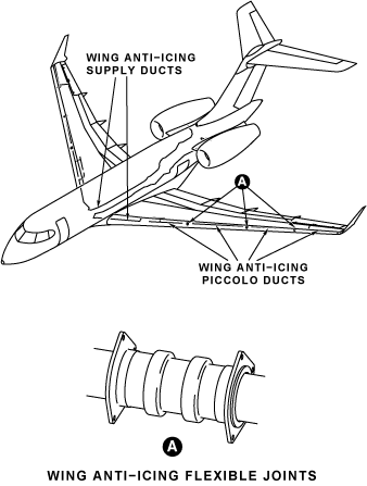 The wing anti-icing flexible joints connect the wing anti-icing piccolo ducts in the slats. They adjust for parallel and axial movement because of pressure loads, deflection of the slat surface, and when the piccolo ducts expand because of the heat. The wing anti-icing flexible joints have one bellows assembly, two seals and two flanges. The wing anti-icing flexible joints have different diameters, which agree with the different diameters of the piccolo ducts.