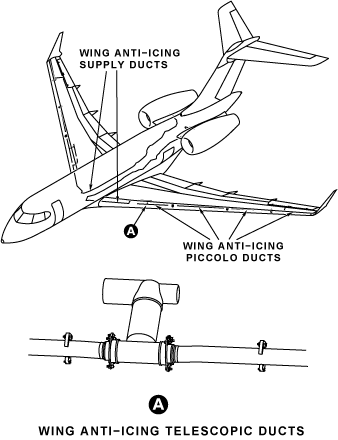 The wing anti-icing supply ducts provide engine bleed air from the duct found in the pylon through the anti-icing modulating-and-shutoff valve. The ducts are found below the floor on each side of the fuselage. They go through the aft and the center fuselage before they connect to the wing anti-icing supply ducts in the belly fairing.