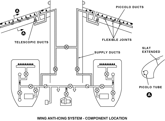 The hot bleed air is supplied to each wing via the distribution ducts through piccolo ducts in the fixed inboard wing leading edge and the slats.