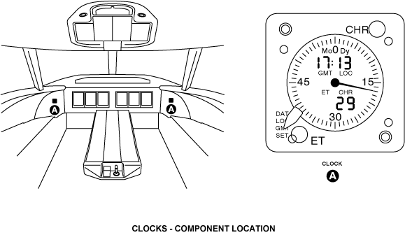 There are two clocks installed, one each on the pilot's side panel and copilot's side panel in the flight compartment. Each clock shows current time in local or coordinated universal time (UTC), slapped time, and chronometer functions. Each clock has an upper and lower four digit displays. The displays are liquid crystal displays (LCD). The upper display shows Greenwich Mean Time or the local time or the date. The lower display shows the elapsed time (ET) or the chronometer function.