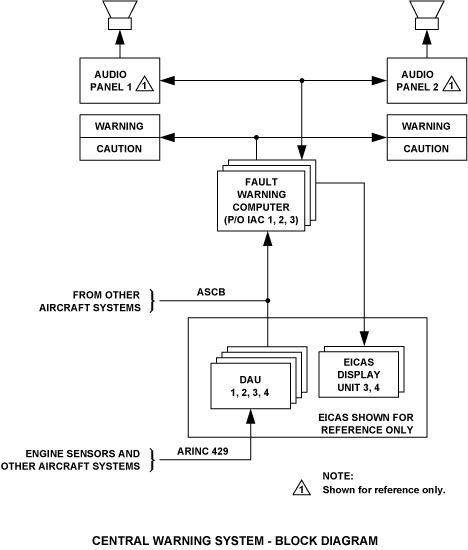 DAU 1, 2, 3, and 4 detect a failure signal from an engine sensor or an aircraft sensor through the ARINC 429 bus. Other aircraft signals are sent along the avionics standard communications bus (ASCB) and operate the tone generators in IAC 1 and IAC 2. IAC 1 and IAC 2 operate in a master/slave relation. In turn, the cockpit speakers 1 and 2 give an aural warning.