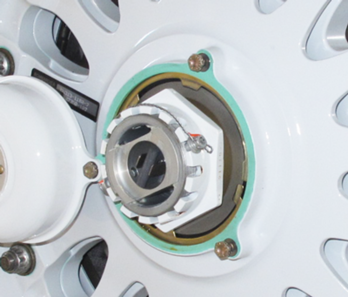 Eight stainless steel inserts are attached to the drive lugs by screws and engage drive slots in the brake rotor disks. The inserts turn the brake disks as the wheel turns.