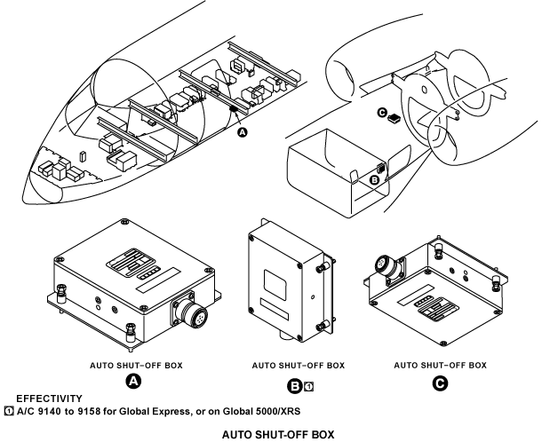 The auto-shutoff box has a cover that you can remove and a mounting flange with captive screws to attach to the aircraft structure. All electrical connections are made through an electrical connector on the forward of the unit. There are two auto-shutoff boxes, one is installed in the aft equipment compartment, and one is installed in the main avionics compartment. The auto-shutoff box in the main avionics compartment controls the nosewheel and the main avionics compartment lights. The one in the aft equipment compartment controls the APU and the aft equipment-compartment lights.