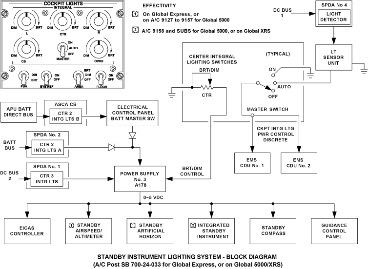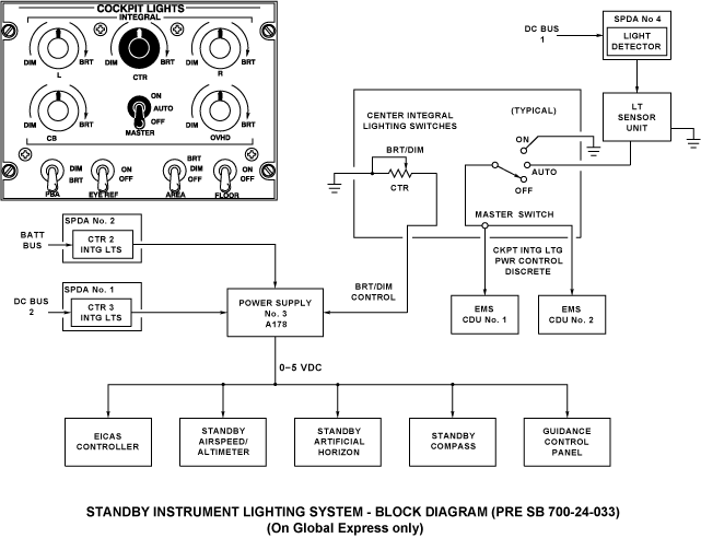Standby instrument lighting operates with the panel integral lighting system, and employs one of the eight power supplies. The DC power supply, assigned to the system, distributes variable lighting voltage to the standby instruments, guidance control panel and the EICAS controller panel.