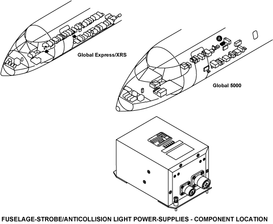 The fuselage strobe/anticollision light is contained in a housing with a xenon flash tube and glass lens. There are two fuselage strobe/anticollision lights installed in the aircraft. The upper strobe light is installed between STA 365.00 and STA 381.00 on Global Express/XRS and at STA 405.00+32.00 on Global 5000. The lower strobe light is installed between STA 445.00 and 461.00 on Global Express/XRS and at STA 405.60+32.00 on Global 5000 on the forward fuselage. Each strobe light has a power supply that supplies high voltage pulses to the strobe lights. The strobe lights can flash red or white.