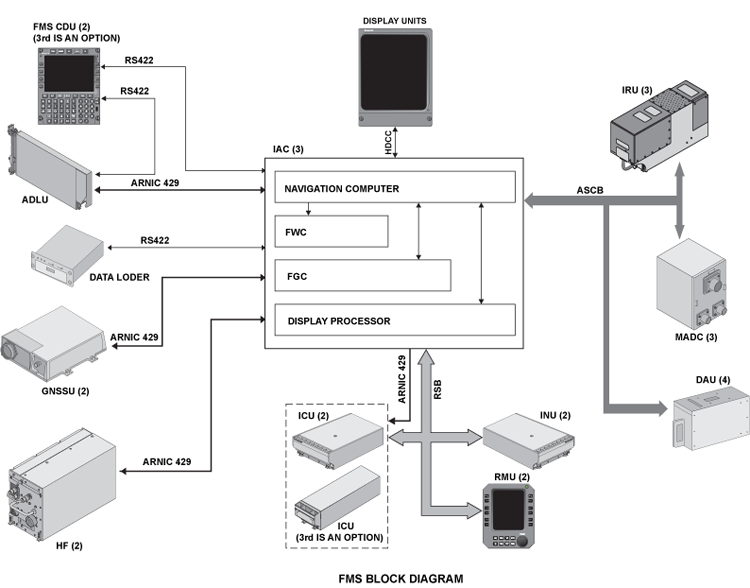 The FMS interfaces directly to the CDU and onboard data loader via RS 422 buses.