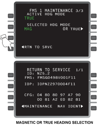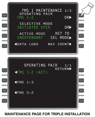 In a dual FMS system, two FMSs are providing navigation data at any one time. By default, these will be FMS 1 and FMS 2. Relays are used to position the optional third FMS (FMS 3) into the dual system as necessary. The pilot can select an FMS 1/3 or 2/3 configuration by using the Maintenance Page on the FMS CDU. Upon selection of the third FMS into the system, the selected FMSs send ASCB messages to DAU 3 which then triggers a discrete output energizing a relay to configure the requested configuration.