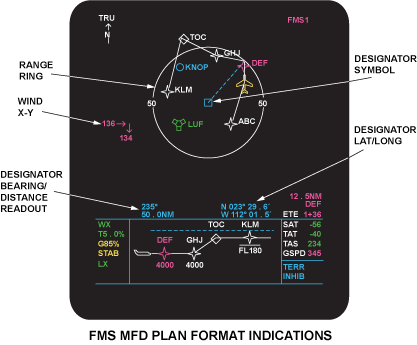 The SKP, RCL pushbuttons and the joystick on the MFD Display Controller are used to control the designator. The primary use of the joystick and designator in the plan mode is to position the circular viewing ring so that either the route being flown or the maneuvering aircraft can be observed.