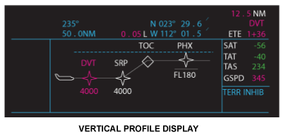 Vertical profile data is the lateral map in the vertical plane, corresponding to the VNAV profile in the active flight plan. Dynamically, the aircraft remains fixed in the center of the vertical field at the far left of the format. The map moves from right to left as a function of distance from a waypoint and up and down with respect to actual aircraft altitude. The vertical presentation shows a change in altitude of ± 20,000 feet from actual aircraft altitude.