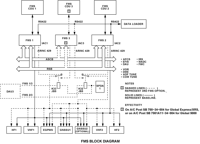 As a dual FMS system, two FMSs give navigation data at any one time. Usually, this will be FMS 1 and FMS 2. Relays are used to put the optional FMS 3 into the dual system as necessary. The pilot can make a selection of FMS 1/3 or FMS 2/3 configuration with the Maintenance Page on the FMS CDU. Upon selection of the FMS 3 into the system, the selected FMS sends an ASCB message to DAU 3 which then causes a discrete output to energize a relay to configure the selected configuration. If FMS 1 or FMS 2 fails during standard operation, that IAC Fault Warning Computer sets a bit on the ASCB to cause DAU 3 to set the discrete output to configure the relay for FMS 1/3 or FMS 2/3 operation.