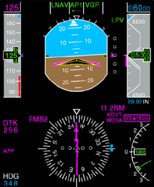 The color of the LPV approach identifier follows the Global Express color philosophy for FMS-based or FMS-managed navigation data. Magenta is used for normal sources, white for non-normal sources and amber for common sources.