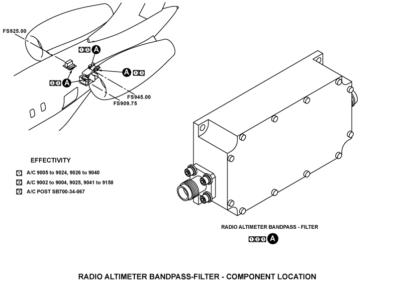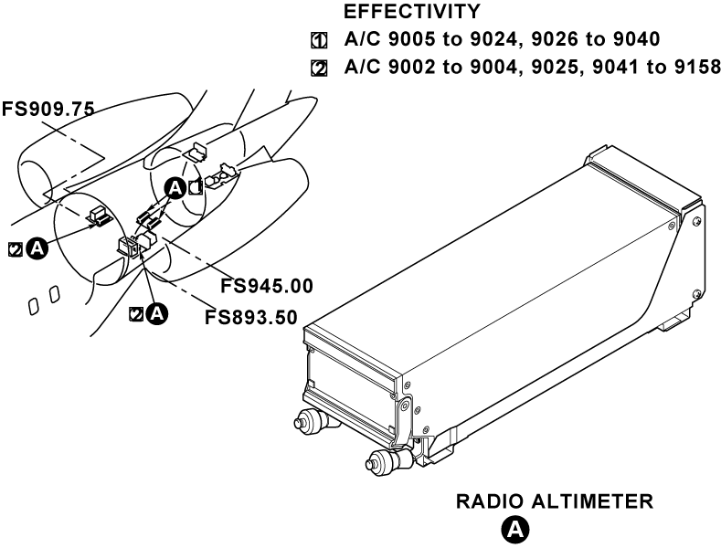 The radio altimeter transceivers are installed in the aft equipment compartment at FS945.00. The two transceivers are installed on the left and right side of the aft equipment compartment. The transceiver transmits, receives, and processes frequency modulated continuous wave (FMCW) signals. The altitude data is distributed to other aircraft systems via an ARINC 429 bus.