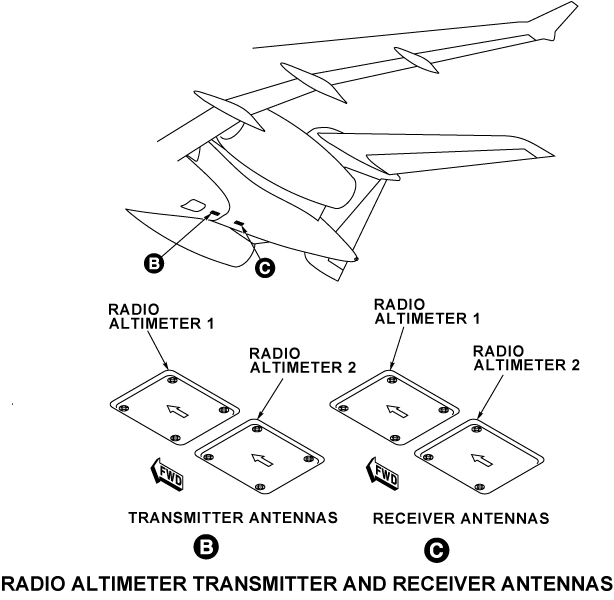 The radio altimeter system consists of two radio altimeter transceivers and four antennas. The dual radio altimeter system, Collins model ALT-4000, measures altitude between the aircraft and the ground (AGL) during the approach phase of the flight. It provides aircraft height from 0 to 2,550 feet.