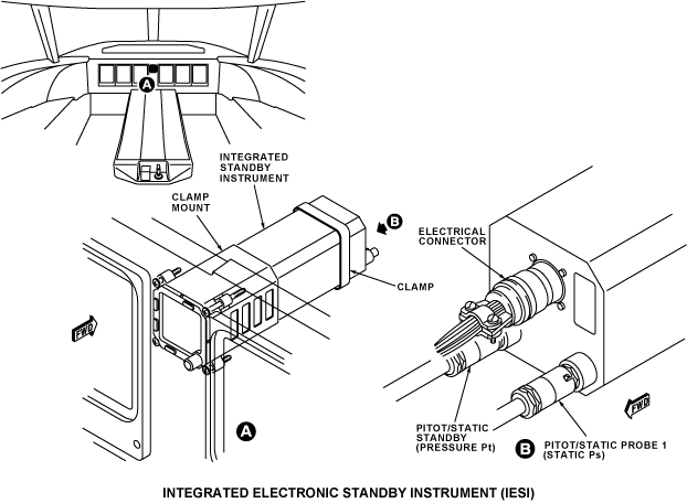 The IESI uses the pitot and static pressures to help calculate the altitude and the indicated airspeed (IAS). The standby pitot static and the pitot static probe 1 connect at the rear of the IESI. The standby P/S probe gives the Pitot pressure (Pt) input. Static pressure (Ps) input is the average of the forward inlet of the standby P/S probe and the aft inlet of the P/S probe 1.