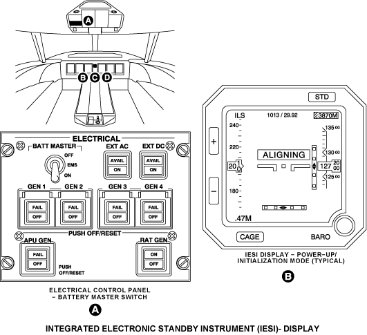 In an emergency condition, when primary aircraft power is not available, the IESI operates with 28 VDC. The SPDA 1 supplies 28 VDC through the AV BATT DIR BUS to the IESI. No pilot effect is necessary to operate the IESI.