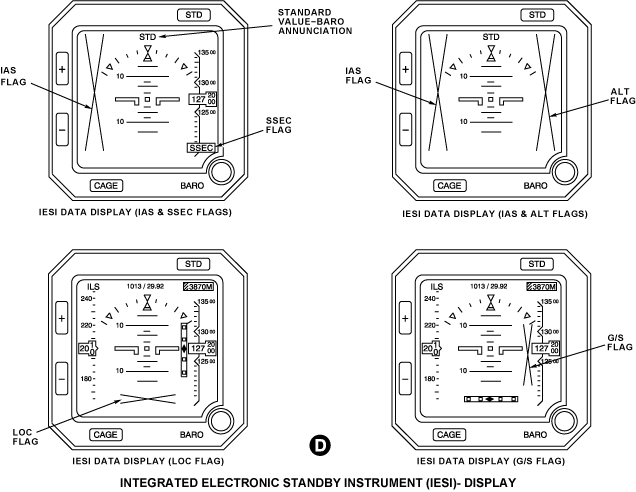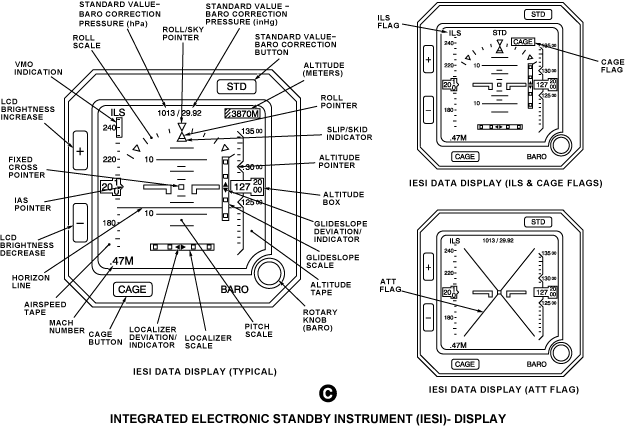 The IESI is a self-contained unit installed on the instrument panel between the EICAS monitors. The IESI displays artificial horizon, altimeter and airspeed information on a liquid crystal display screen.
