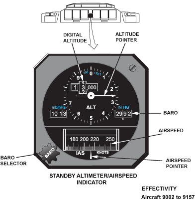 The standby airspeed/altimeter system supplies the flight crew with backup display of barometric altitude and airspeed indications.
