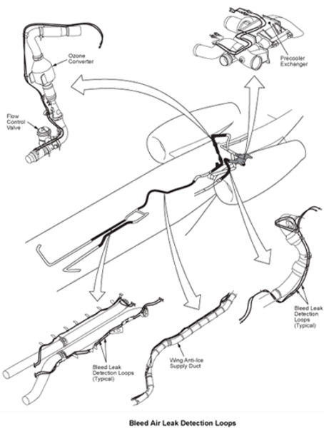 The bleed air system has sense elements (loops) installed along the insulated ducts of the pneumatic system to sense any overheat caused by leaks. The wing anti-ice system has loops installed along the wing supply ducts and piccolo tubes. The air conditioning system has loops installed along trim air duct. The duct insulation has holes to direct any leaks over the sense elements.