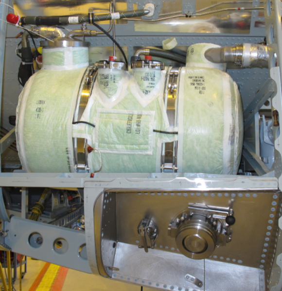 The waste tank has a useable capacity of 16 U.S. gal (60.5 liters). It is made from lightweight stainless steel. An air/water separator vents fumes overboard an prevents water from freezing in the exhaust duct. Two ultrasonic full level sensors will shut down the waste system if both sensors signal a full tank condition.