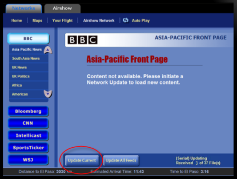 Airshow network updates are transmitted from the airshow communication center ground station via the Iridium communication system (ICS) using an RS232 serial data link. Airshow network updates must be manually initiated by selection of a button on the Airshow Network page.