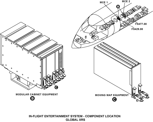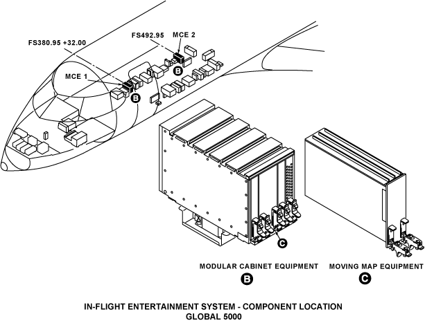 The ASXi software resides in the moving map equipment (MME) in MCE 1. The MME provides a processor that is independent from the basic cabinet processor. The MME processor and hard disk host the software applications such as the moving map, audio on demand server, and video on demand server. To support airshow, the MME is continuously supplied with flight environment data from the FMS via ARINC 429 received by the PME through Ethernet. Airshow can only display flight-specific views if a flight plan has been programmed into the FMS.