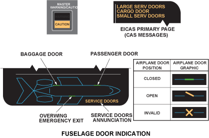 The door warning system uses proximity sensors to give caution messages on the engine indication and crew alerting system (EICAS) in the flight compartment. The door warning system uses part of the landing gear electronic control unit (LGECU). The warning system is on the doors that follow: