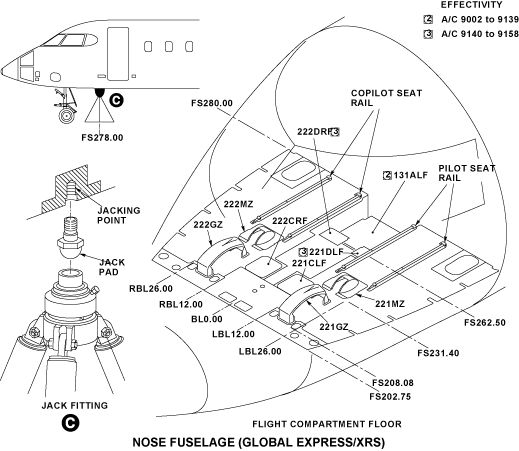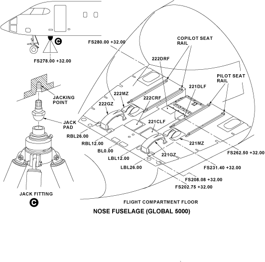 One jack fitting is supplied to permit to lift the nose fuselage. The jack fitting is attached with rivets to the intercostal installed between FS265.00 and FS280.00 for Global Express/XRS and between FS265.00+32.00 and FS280.00+32.00 for Global 5000. It is installed on the center line, at the bottom of the nose fuselage.