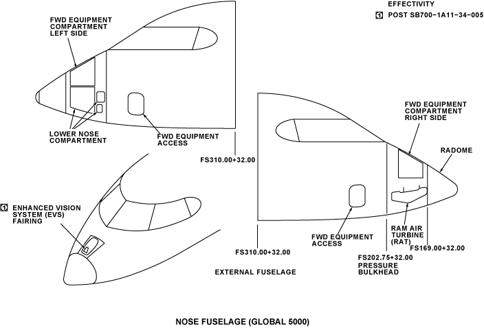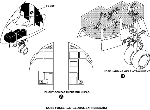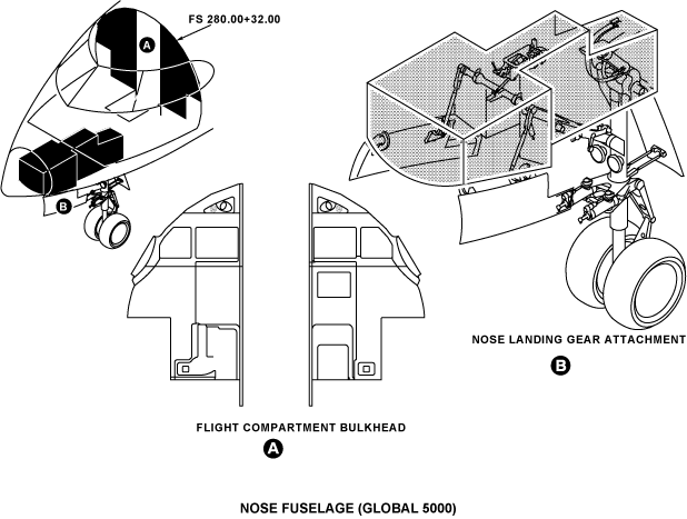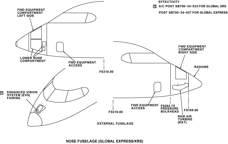 The nose fuselage is found between FS144.00 and FS280.00 for Global Express/XRS and between FS144.00+32.00 and FS280.00+32.00 for Global 5000 and includes the flight compartment. Doors and panels give access to different parts and equipment of the aircraft.