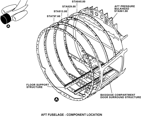 The aft fuselage floor is found between FS781.00 and FS861.00. The floor includes the support structure made from connected longitudinal and lateral beams. This also includes floor panels which extend into the baggage compartment for the baggage support.