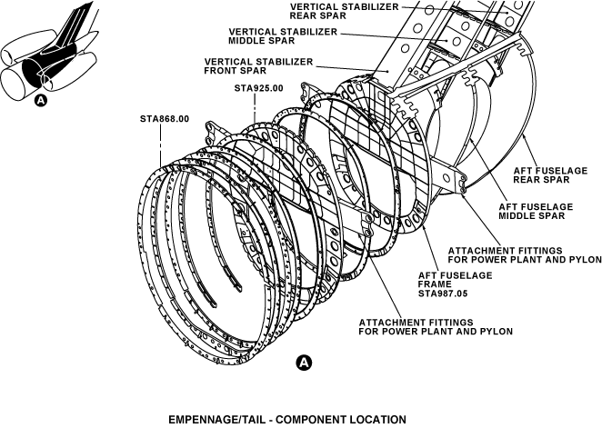 The front spar of the vertical stabilizer is attached with two fittings, and each have four legs. The location of the fittings is on the top of the aft engine mount at frame FS987.05. The top leg of the fitting is attached to the front spar of the vertical stabilizer. The bottom leg is vertical and is attached to the aft face of the fuselage frame. The forward leg is horizontal and attaches to the longeron platform in the aft fuselage. The aft leg is also horizontal and attaches to the upper skin panel aft of the fuselage frame.