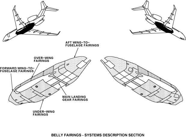 The fuselage aerodynamic fairings are the nose radome, the EVS sensor fairing and the belly fairings. The nose radome, the EVS sensor fairing and fairings at the wing-to-fuselage interface make the aircraft aerodynamic.