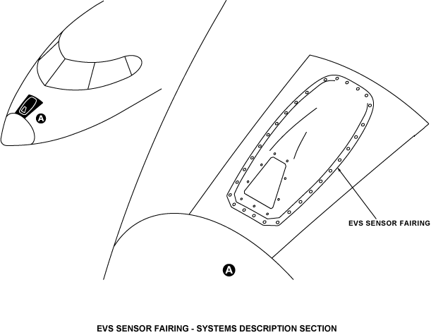 The EVS sensor fairing is installed on the nose fuselage between FS169 and FS193 and between FS169+32.00 and FS193+32.00 for Global 5000 on A/C Post SB 700-1A11-34-005. The fairing is made of composite material. It is an aerodynamic surface covering the EVS sensor.