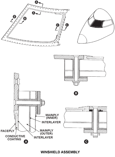 There is a right windshield and a left windshield at the front of the flight compartment on the aircraft center line. The windshield assembly is a bonded structure which includes the component that follows:
