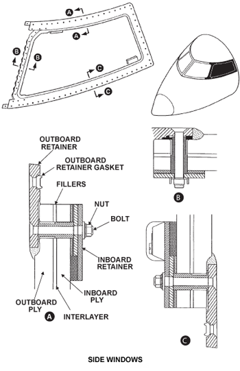 There is a left side window and a right side window in the flight compartment that do not open. They are adjacent to and immediately aft of the left and right windshields. The side window assembly is a bonded structure which includes the component that follows: