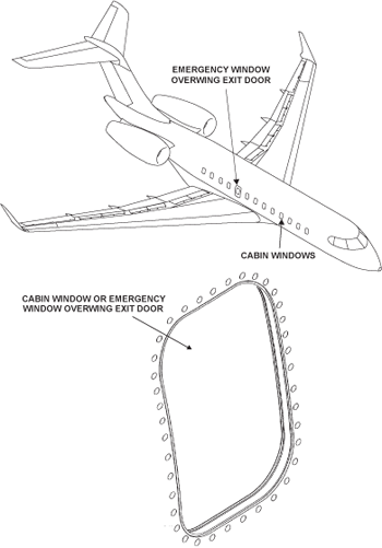 The passenger compartment windows are situated on both sides of the fuselage. One of the windows on the right side of the fuselage is part of the overwing emergency door. This window has a different dimension and shape. The other cabin windows have equal dimensions and the same shape, and they are interchangeable.