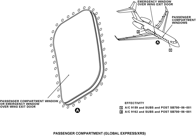 In a standard configuration, on Global Express/XRS, each side of the fuselage has 13 passenger compartment windows. As an option, one window can be installed at the forward right side of the fuselage at FS338.20 and/or one window can be installed at the aft right side of the fuselage, at FS788.76. On Global 5000, there are 11 passenger compartment windows installed on the left side of the fuselage, and 12 passenger compartment windows installed on the right side of the fuselage. One window installed on the right side of the fuselage, in the overwing emergency door, has a different dimension and shape. The other windows have equal dimensions and shape, and they are interchangeable.