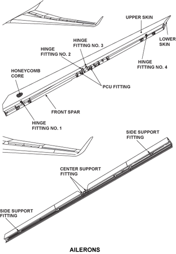 There are four support fittings for each aileron, two center support fittings, and two side support fittings. They are attached on the rear spar of each wing to install the ailerons.
