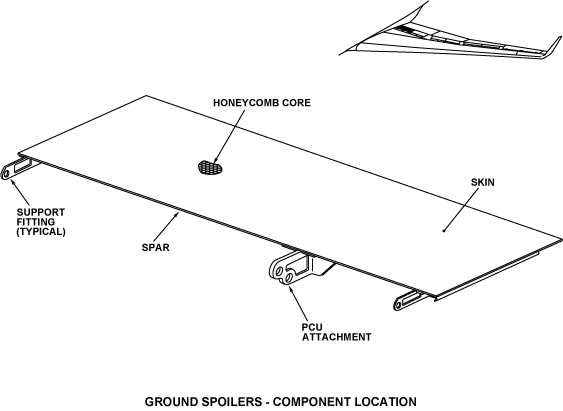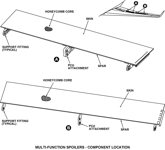 The spoilers are made of a phenolic sheet, three support fittings, and a honeycomb core. The top and bottom skin panels are made of graphite laminations. Each spoiler has three support fittings that are attached to the auxiliary or rear spar of each wing. All the support fittings are made from aluminum alloy. The outboard support fittings of each spoiler has bushings installed in the hinge pivot points. The center and inboard support fittings of each spoiler and the outboard support fittings of the inboard ground spoiler have spherical bearings. The center support fittings are also the attachment points for the power control units (PCUs).