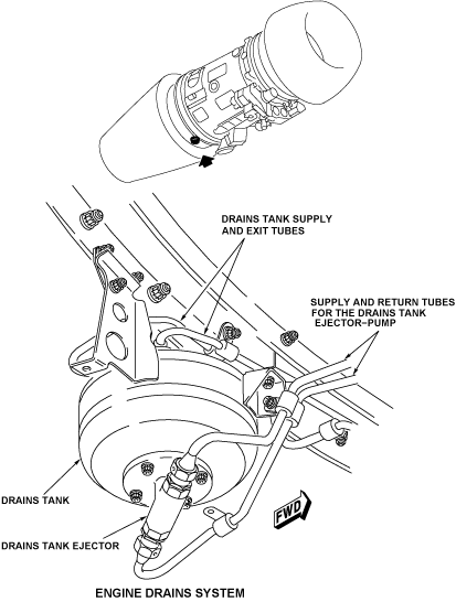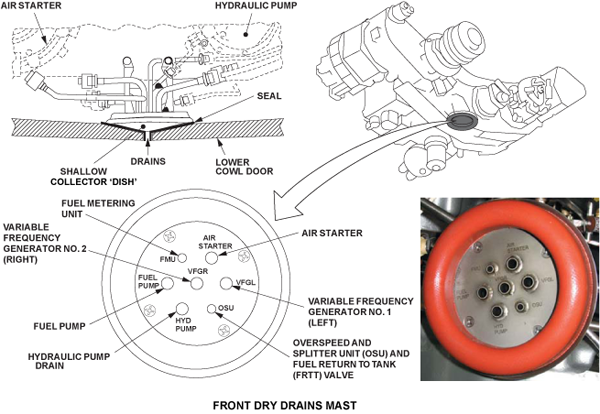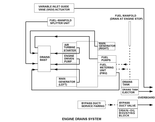 The engine drains system has many tubes that connect to specified components of the fuel, oil and hydraulic systems. The tubes are connected to the components with bolts or a nut and nipple connection. These tubes which let fluid leakage from applicable components move to a drain point. There are two drain points in the bottom of the engine nacelle to remove unwanted fluid.