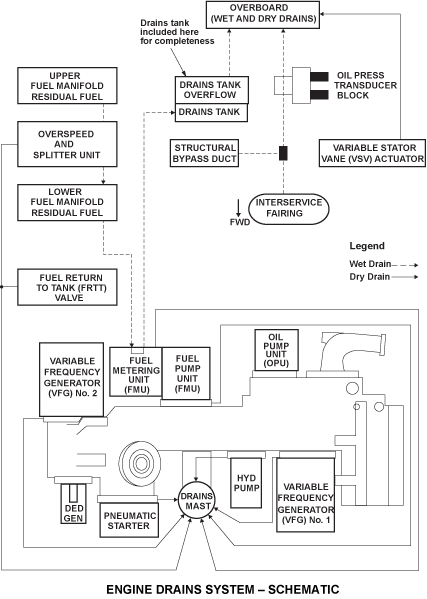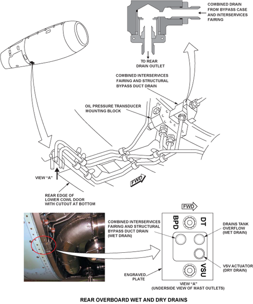 There are two wet drain outlets: drain tank overflow, combined interservices fairing and bypass case drain - Dry drains: All the other drains are designated as dry drains. A fluid loss may indicate the failure of a fuel or oil pipe within the core area. It requires maintenance action before the airplane is released for flight