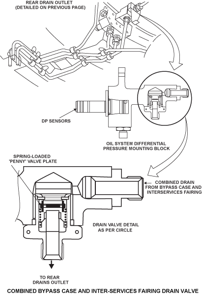 This drain valve is attached to the oil pressure transducer mounting block, which is mounted near the bottom of the engine rear support ring and allows drainage of the fluid when it is not running, and prevents loss of bypass air when it is running. The valve consists of a plate valve supported by a light spring assembled into the lower connector union.