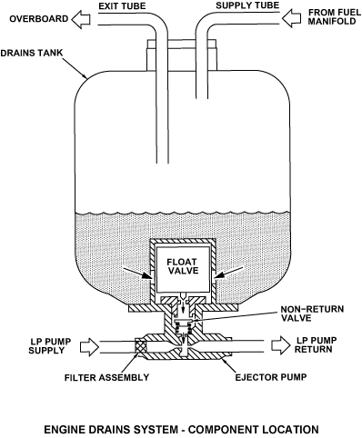 The drains tank ejector valve is at the bottom of the drains tank. It has two fuel tube connections. The fuel tubes move the low pressure (LP) fuel flow to the ejector pump. The ejector has a non-return valve and a float valve. When LP fuel flows through the ejector pump, the pressure in the tank becomes more than in the ejector pump. This lets fuel to be removed from the tank and sent back with the LP fuel supply to the pump.